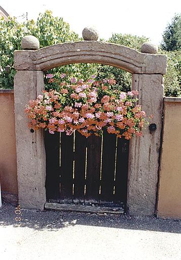 Porte composée de deux piédroits et d'un linteau en arc segmentaire monolithes. Le sommet de chacun des piédroits est couronné d'une boule ainsi que la partie médiane du linteau.