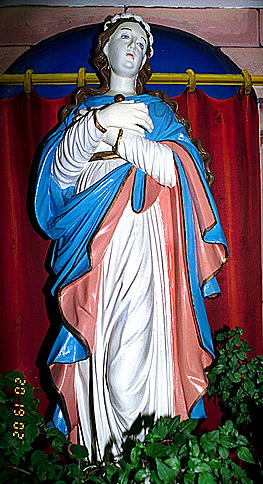 Vierge aux mains croisées sur la poitrine, couronnée de fleurs.