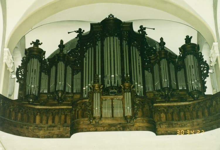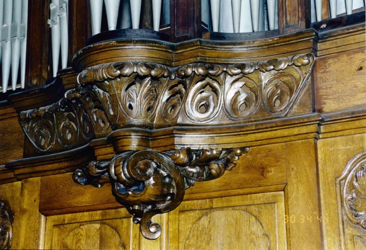 Le buffet est très composite : corps central accosté de deux corps à 3 tourelles et deux tourelles extérieures, avec plates-faces entre ces éléments. Le positif de dos est factice. Pots à feux décoratifs et anges musiciens sont posés sur la corniche.
