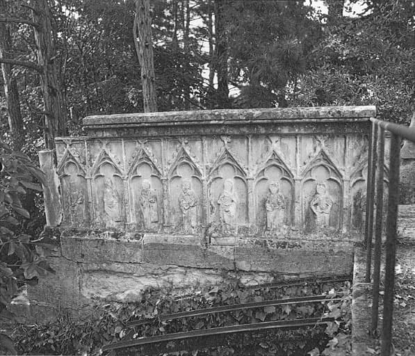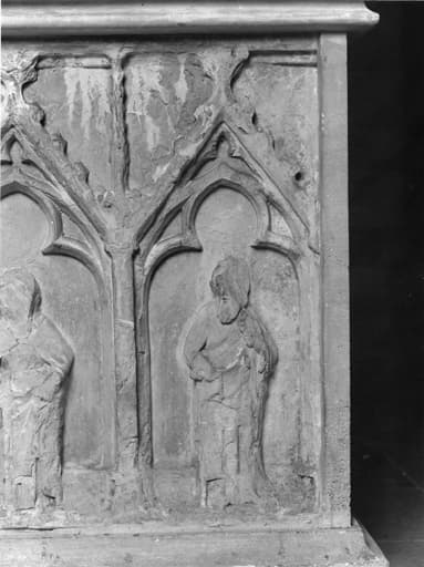 Ensemble de huit personnages (saints et saintes ?) placés sous arcatures trilobées ornées de fleurons et de crochets.