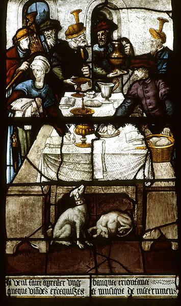 Cette verrière mise en place lors de l'édification du collatéral dans le 2e quart du 16e siècle a été recomposée. Selon un cliché Durand (date) seul le panneau central est à sa place d'origine. A la place du mauvais riche enlevant son manteau il y avait la circoncision et à la place du pauvre se trouvait la naissance de Jean-Baptiste. Le bas était composé de trois panneaux décoratifs semblables à celui qui est au centre, alors qu'on y voit aujourd'hui l'âme du riche brûlant en enfer et l'âme du pauvre portée par des anges. La scène du festin peut être rapprochée d'une gravure de Heinrich Aldegraver (1502-vers1560) conservée à la BnF.