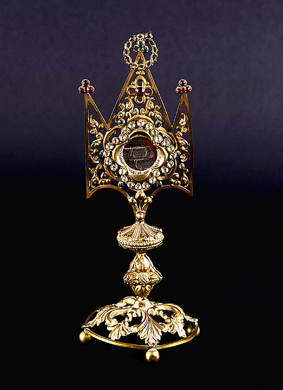 reliquaire en forme de monstrance reposant sur un pied circulaire orné de feuilles découpées. La tige possède un noeud et une large collerette. Le reliquaire lui-même est en forme de triptyque schématique. Il est orné de fausses pierres précieuses en verroterie