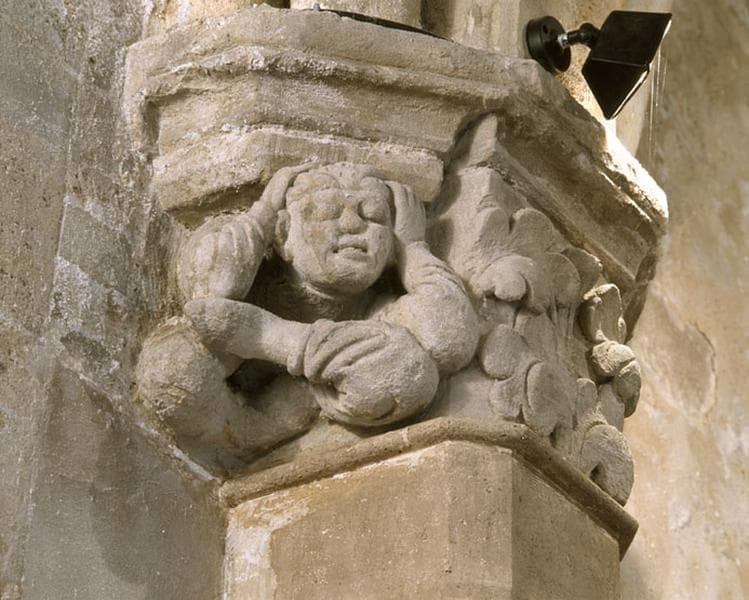 Ce chapiteau se trouve dans la partie la plus ancienne de l'église. Il supporte la retombée de l'ogive du bas côté. Mais le chapiteau dont il fait partie a subi des transformations comme l'atteste le tailloir discontinu.