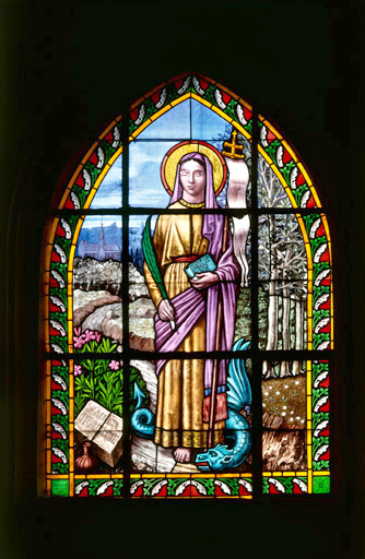figure (sainte Theudosie, en pied, palme, livre, croix, dragon, cathédrale : Amiens, forêt)