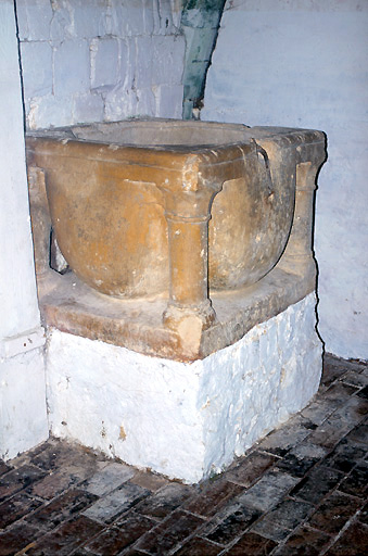 Les fonts baptismaux présentent une large cuve de plan presque carré, fixée sur un petit socle en moellons de calcaire peints, et cantonnée par quatre colonnettes à chapiteau sculpté. La cuve proprement dite a une ouverture hexagonale, puis s'arrondit dans la partie basse. Une attache en fer, sur le côté donnant vers le choeur, maintenait un couvercle aujourd'hui disparu. Un trou d'évacuation est percé au fond de la cuve.