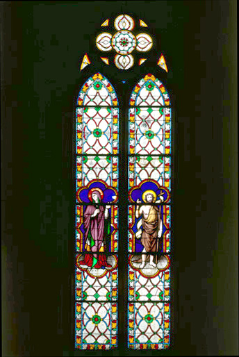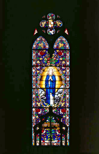 Baie 0 : l'Immaculée Conception, dans un médaillon ovale, est entourée de rinceaux peuplés de grues, et surmontée d'une couronne de roses. Sous le médaillon est placé un cartel avec inscription latine, porté par un grand lys. Baie 1 : sainte Elisabeth et saint Jean-Baptiste. Baie 2 : saint Joachim et sainte Anne. Baie 5 : litanies de la Vierge. Baie 6 : litanies de saint Joseph.