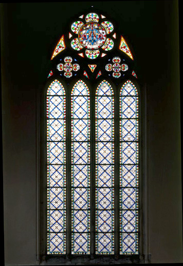 La baie d'axe comprend une lancette unique surmontée d'un quadrilobe. Les baies 1 et 2, à deux lancettes, comportent des médaillons à grandes figures entourés d'ornements végétaux et géométriques employant surtout la grisaille. Les baies 5 et 6, dans le transept, sont beaucoup plus vastes que celle de l'abside. Leurs verrières comptent quatre lancettes surmontées de trois roses, traitées en grisaille. Sur le plan technique : utilisation de verres rouges gravés à l'acide pour les grues et les roses de la baie d'axe.