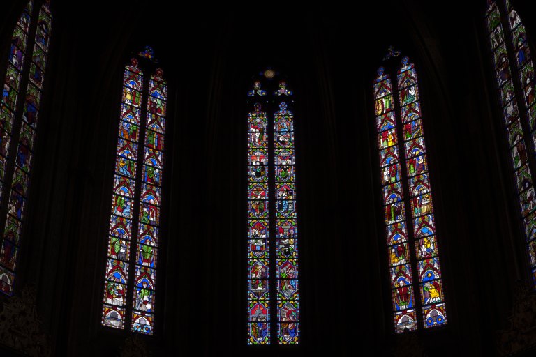 Baie 100 : scènes de la vie du Christ et de la Vierge : Nativité de la Vierge ; présentation de la Vierge au temple ; Annonciation ; mariage de la Vierge ; Crucifixion ; ascension ; pentecôte ; Christ ressuscité.£Baie 101 : scènes de la vie de saint Alain.£Baie 102 : scènes de la vie de saint Martin de Tours : saint Martin évêque ; miracles de saint Martin.£Baie 103 : scènes de la vie du Christ : Annonce aux bergers ; présentation au temple ; fuite en Egypte ; Jésus et les docteurs ; Baptême du Christ ; Transfiguration ; la Samaritaine au puits ; la femme adultère ; le sermon sur la montagne ; Noli me tangere.£Baie 104 : David ; histoire de Moïse ; Adam et Eve.£Baie 10 : ornemental.£Baie 12 : Christ du Sacré-Coeur ; armes de Pie IX.£Baie 14 : sainte Véronique et la Sainte-Face ; portement de Croix.£Baie 106 : saint Alain ; tiare.£Baie 108 : armes de Jean Gentian.£Baie 110 : armes de Gilles de Bellemère.£Baie 112 : armes de Bernard de Chevenon.£Baie 114 : (blason disparu).£Baie 116 : de haut en bas, armes de : Bernard de Maumont ; Charles-Guillaume de Maupéou ; Archambaud de Lautrec ; René le Sauvage ; Hector de Bourbon ; Jean-Vincent de Tulle ; Pierre de Buis ; Jean-Charles de Ségur ; Jean Boucher ; Charles Le Goux de la Berchère.£Baie 206 : armes de Roger d'Armagnac ; date de 1318.£Baie 208 : armes de Simon de Beausoleil ; date de 1515.£Baie 210 : (vide).£Baie 212 : armes de Jean de Boisgelin de Cucé ; date de 1765.£Baie 214 : armes de Nicolas de Malézieux.£Baie 9 : sainte Bernadette (?) ; armes d'Henriette de Bourdoncle de Saint-Salvy.£Baie 11 : Salvator mundi ; enfers.£Baie 13 : saint Pierre, en pied ; armes de Pie IX.£Baie 15 : ornemental ; armes de Jean-Emile Fontenau.£Baie 17 : ornemental.£Baie 19 : Baptême du Christ ; Adame et Eve chassés du Paradis.£Baie 21 : ornemental.£Baie 105 : Vierge immaculée ; tiare.£Baie 107 : armes de Michel Amelot de Gournay.£Baie 109 : armes de Pierre Neveu.£Baie 111 : armes de Pierre de Vissac.£Baie 113 : armes de Jean-Antoine de Castellane.£Baie 115 : ornemental.£Baie 205 : armes de Robert de Vie ; date de 1368.£Baie 207 : armes de Pierre Danès ; date erronée de 1338.£Baie 209 : armes de Victor de Mailly ; date de 1687.£Baie 211 : armes fantaisistesBaie 213 : armes de Jean-Antoine de Castellane.
