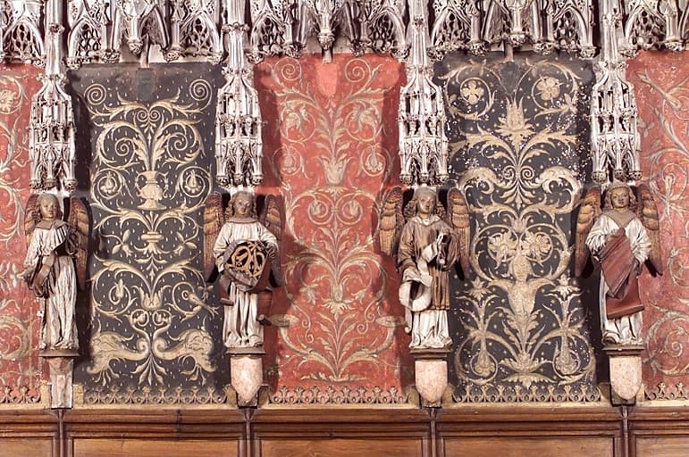 Au dessus des stalles disposées en amphithéâtre face au sanctuaire, se détachant sur des fonds de couleur alternativement rouges ou bleus décorés d'arabesques et surmontées de dais finement ajourés, les statues des anges attirent l'attention et surprennent par leur nombre. Soixante dix figures d'anges se répartissent tout le tour ; trente quatre au sud, du côté de la chaise épiscopale, trente six du côté nord. Deux autres, placées sous le jubé dans le vestibule donnant accès aux escaliers à vis et à la porte occidentale du choeur s'ajoutent aux précédentes. Dans le sanctuaire, deux anges flanquent la Vierge à l'Enfant ; soit un total de soixante quatorze anges à l'intérieur du choeur sans compter ceux du déambulatoire et du jubé. On en trouve deux à l'extérieur du sanctuaire, de part et d'autre du vieillard Siméon, un au revers du jubé, côté sud, deux autres sur la façade intérieure du jubé, côté nord, l'ange de l'Annonciation à l'extrémité sud du déambulatoire, celui qui lui est symétrique du côté nord et dix angelots supplémentaires placés sous le jubé du côté de la nef. Au total, quatre vingt onze anges peuplent la clôture du choeur de la cathédrale d'Albi.£Tous sont placés sur une même ligne horizontale à 22 cm au dessus des hauts-dossiers.Chacun est posé sur une console présentant un blason qui le sépare des boiseries. 60 cm les séparent les uns des autres excepté les angelots placés dos à dos de part et d'autre de la porte centrale du jubé, distants de leurs voisins de 52 cm seulement. Cet espacement régulier coïncide partout avec les moulures latérales des hauts dossiers. Chaque stalle se trouve ainsi flanquée de deux anges car les moulures de bois sont prolongées dans la pierre par une moulure identique sur laquelle prennent naissance la console soutenant les anges et le dais les surplombant.£Les anges d'Albi ont revêtu le costume sacerdotal. Certains ne portent que l'aube des acolytes (ils sont 39), d'autres ont endossé la dalmatique des diacres (ils sont au nombre de 43). Quatre d'entre eux tiennent une étole. Neuf autres portent la chape qui est depuis le XIe siècle, un habit de choeur réservé aux offices et porté par le célébrant dans les fonctions solennelles 38. Dans leur ensemble, les anges d'Albi n'ont que deux vêtements : la dalmatique, la chape ou l'étole sont passées par dessus une aube blanche. Seul l'ange de l'Annonciation a revêtu une aube, une dalmatique, une chape et une étole. Dans leur majorité, l'aube des anges est de couleur blanche, les dalmatiques et les chapes sont dorées, rouges, vertes ou bleues et correspondent à des couleurs liturgiques. Le blanc est la couleur des ministres de l'autel depuis de IVe siècle. Cette couleur liturgique symbolise, l'éternité, la pureté, la virginité et l'agneau sans tache. Elle est utilisée pour les jours de fête du Seigneur et de la Vierge ou pour l'Epiphanie. Le doré est associé à la lumière éclatante du paradis. Le rouge (ou gueules) est la couleur du sang, du feu. Elle est dans la mystique chrétienne l'emblème de l'amour divin. Elle est revêtue pour fêter les martyrs ou la Pentecôte. Le vert (ou sinople), couleur de la végétation, symbolise l'amour naissant, la vertu chrétienne et l'espérance. Il est porté pour toutes les autres occasions. Le bleu (ou pers), représente pour sa part la couleur du manteau de la Vierge.£Plusieurs anges présentent les armes de Louis d'Amboise "palées d'or et de gueules à six pièces". Elles ont été bûchées à la Révolution mais celles de l'ange 65, mieux préservées, permettent de restituer les autres dans leur disposition originale : accompagnées de la crosse épiscopale. Cette dernière dernière présente sur sa partie curviligne la forme d'une tige fleuronnée qui se divise en deux branches à son extrémité. La première se recroqueville et emplit de son feuillage le coeur de la volute, la seconde retombe vers le bâton et vient se souder sur le chef du blason.£Les anges sont également associés à la célébration du mystère eucharistique qui se déroule dans le choeur. Sept d'entre eux présentent les instruments de la passion du Christ. On remarque la colonne de la flagellation (ange 53), le fouet (ange 69), la couronne d'épines (anges 16 - 38 - 79 - 84), et probablement la lance (ange 46) 43. A plusieurs reprises, la couronne d'épines entoure les monogrammes du Christ ou de la Vierge. Dans la clôture du choeur, ces éléments se retrouvent. La couronne d'épines ceint le monogramme du Christ dans les travées à claire-voie qui entourent le sanctuaire.