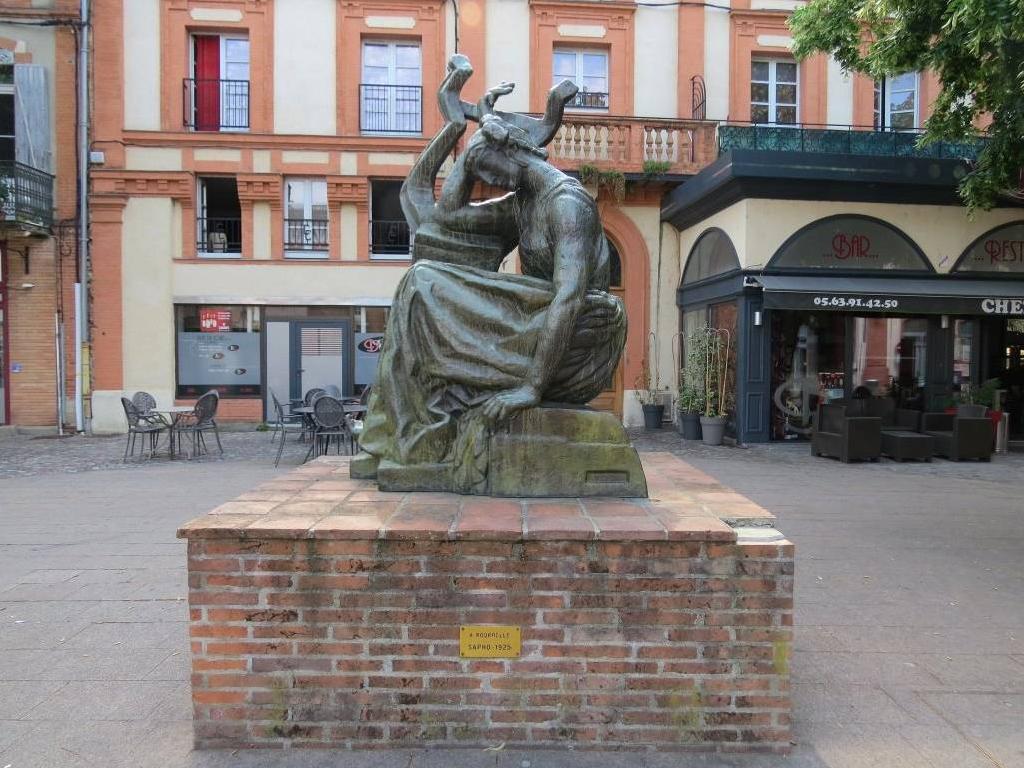 Le choix de la figure de Sapho, comme celui de Pénélope, traduit l'intérêt d'Antoine Bourdelle pour l'Antiquité. Commencée en 1887, l'oeuvre n'est achevée par le sculpteur qu'en 1925. Malgré une certaine rudesse dans le traitement des surfaces, elle illustre les débuts de la distance que prend Bourdelle par rapport à son maître Rodin. L'oeuvre a été acquise par la ville en 1987 grâce au leg de Rhodia Dufet Bourdelle, fille de l'artiste. A l'origine elle était placée à la Fobio, proche de la piscine municipale, elle a ensuite été déplacée place Lefranc de Pompignan.