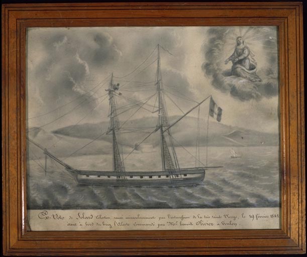 transcription : EX.VOTO DE SOLARD CELESTIN, SAUVE MIRACULEUSEMENT PAR L'INTERCESSION DE LA TRES SAINTE VIERGE, LE 19 FEVRIER 1841 ETANT A BORD DU BRIG L'ALERTE COMMANDE PAR MR BENOIT OLIVIER A TOULON (partie inférieure de l'oeuvre).