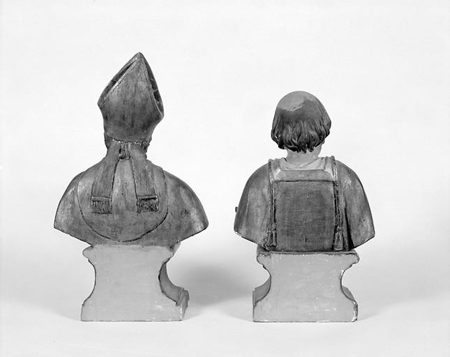 Buste reposant sur un piédouche relativement haut, à profil galbé ; fenêtre ovale, vitrée, à pourtour chantourné, aménagée au niveau de la poitrine de chaque buste et laissant voir les reliques ; buste et piédouche exécutés dans deux éléments différents.£Piédouche et vêtements des saints dorés ; peinture brune pour cheveux, barbe et yeux ; peinture couleur carnation pour visage ; décor rapporté autour de la fenêtre ; sous le piédouche : deux trous, vraisemblablement trous de fixation