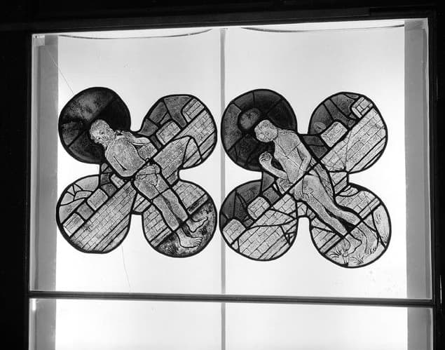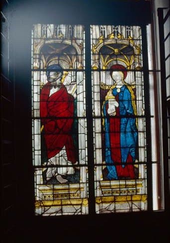 verre transparent (coloré) : peint, grisaille sur verre ; plomb (réseau)