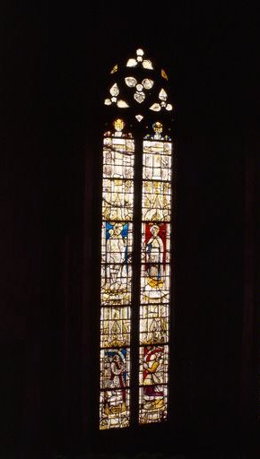 verre transparent (coloré) : peint, grisaille sur verre ; plomb (réseau)