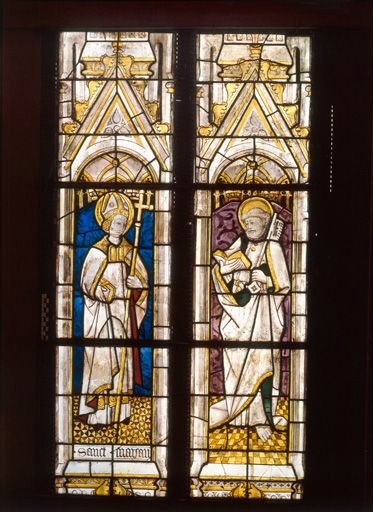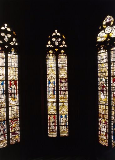 verre transparent (coloré) : peint, grisaille sur verre ; plomb (réseau)