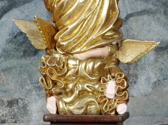 L'ange de droite a perdu une aile ; la statue présente des traces de vermoulure et mériterait une restauration.