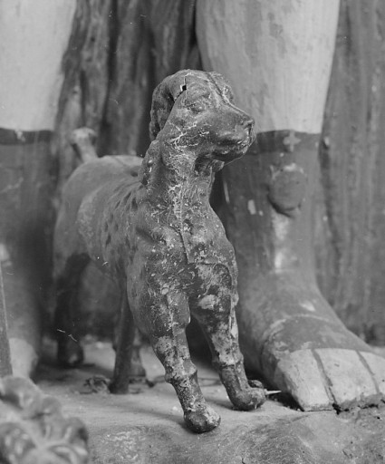 planchette de bois rapportée avec un chien, portant sur un bât un fagot de bois, voulant probablement figurer un loup