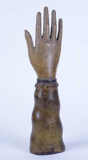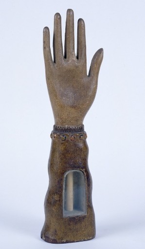 La manche est recouverte d'un jus doré sur préparation blanche. La main est peinte au naturel. La face interne du bras présente une logette à reliques avec un regard vitré.