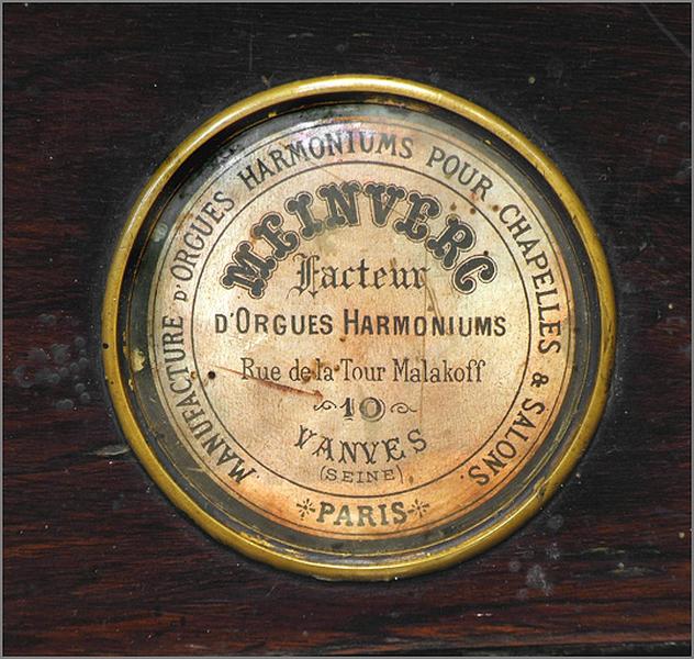 Inscription concernant le fabricant : Manufacture d'orgues harmonium pour chapelles & salons Paris / Meinverc / facteur / d'orgues harmonium / rue de la tour Malakoff / 10 / Vanves.