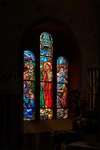 Ensemble de 9 verrières composé d'un oculus et de 8 verrières à 3 lancettes. Les sujets représentés sont : verrière du chur (rose) 0 : la Cène entourée de fruits, paons et cerfs, 1 : la multiplication des pains, 2 : les noces de Cana ; verrières de la nef, 3 : Notre-Dame de la Maix, 4 : la sainte Famille, 5 : sainte Jeanne d'Arc entendant les voix, 6 : scène de la 1ère guerre mondiale, 7 : baptême du Christ, 8 : L'Enfant prodigue.