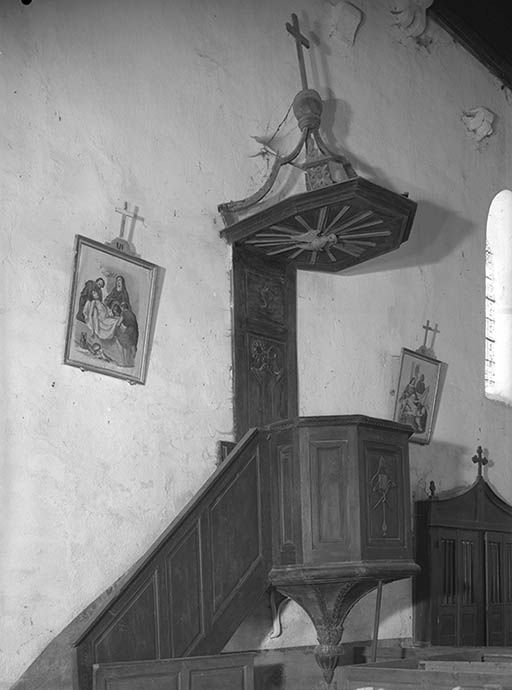 Description : colombe du Saint-Esprit sous l'abat-voix, ciboire, calice et ostensoir sur le dorsal, mitre, crosse, croix, livre et encensoir sur le panneau central de la cuve.