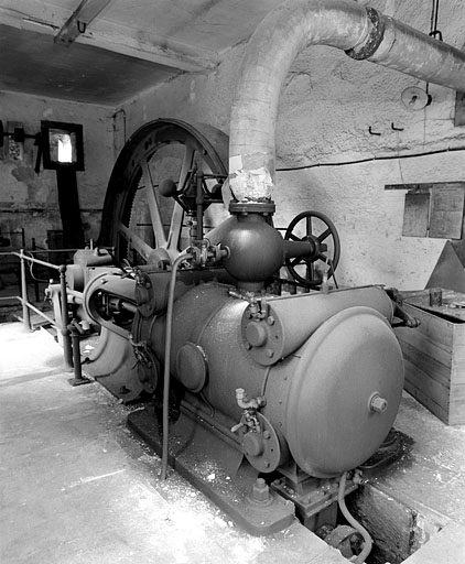 Machine à vapeur monocylindrique, à double effet, à distribution de type Frikart, et à régulateur à boules. Admission de la vapeur par deux cylindres supérieurs et échappement par les deux cylindres inférieurs. La machine développait une puissance de 100 à 120 ch. La force motrice était transmise à l'atelier des métiers à tisser par le jeu de deux poulies de renvoi et de courroies de chanvres de section carrée passant à l'extérieur. Cette transmission a ensuite été supprimée et la machine directement reliée à un alternateur Alsthom (1000 tours/minute, production de courant continu). La machine était alimentée en vapeur par deux chaudières de marque Scheidecker Frères et Cie (Thann, 68), encore en place actuellement. Alimentées en charbon, équipées d'un économiseur Green (Hallines par Wizernes, 62) et de souffleries alimentées par moteur électrique individuel, ces chaudières portent les dates 1927 et 1936 et ont été installées par l'entrepreneur de fumisterie industrielle Jules Rietsch (Belfort).