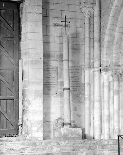 Croix liée, selon la légende, à l'histoire de la construction de l'église à laquelle participa Hodierne de Montlhéry ; celle-ci n'éprouva aucune douleur en ramassant un morceau de fer rougi au feu par le forgeron qui par cruauté le lui proposa pour porter ses seaux ; cette barre de fer servit à faire une croix qui fût plantée dans une colonne monolithe provenant d'un temple de Mercure situé pendant l'époque gallo-romaine au hameau du Mesnil, à proximité de l'ancienne voie romaine ; implantée à ce carrefour dit 'de la Croix Rouge-Fer', elle a été remontée à l'intérieur de la basilique en 1931 après restauration ; une copie a été placée au carrefour en remplacement de l'original.
