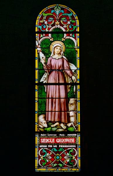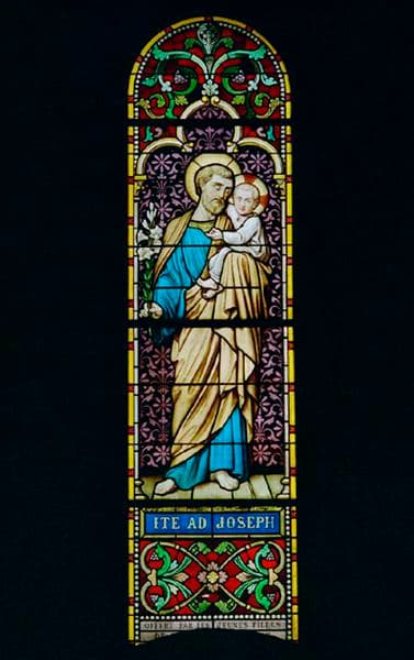 ensemble de 6 verrières à personnages : saint André, sainte Geneviève, Apparition du Sacré-Coeur à Marguerite-Marie, saint Joseph, saint Pierre, Notre Dame de Pellevoisin (baies 3 à 8)
