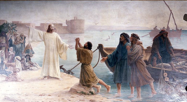 scène biblique (saint Pierre : clé, ville : Jérusalem, Les apôtres, Christ) ; scène biblique (Pêche miraculeuse, Christ, barque, Apôtre, femme, enfant, lac, ville) ; ornement à forme géométrique