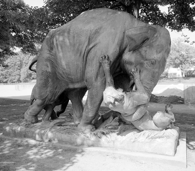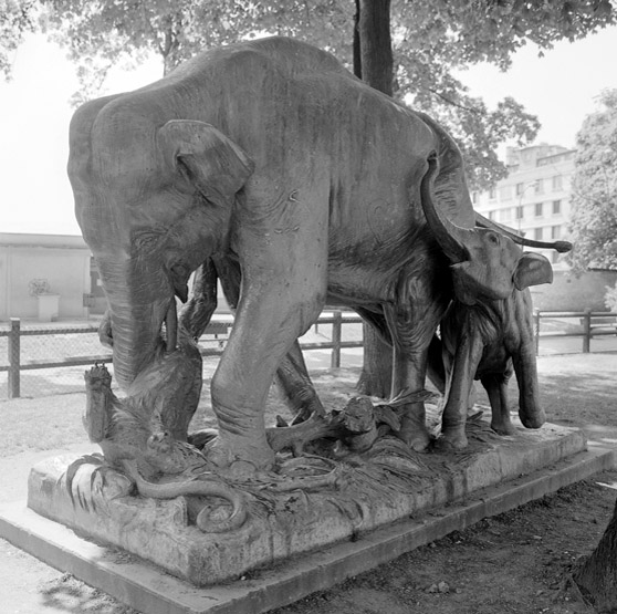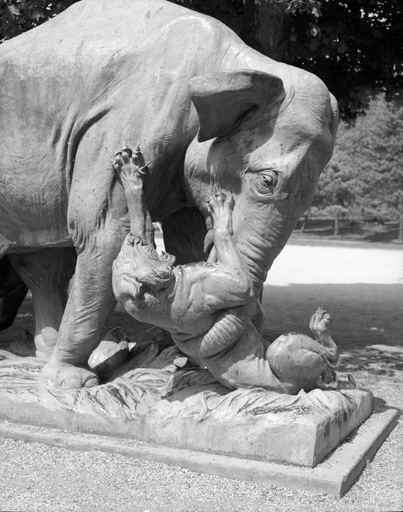 Groupe sculpté relié dit les éléphants attaqués par un tigre ; le plâtre du sculpteur Georges Gardet (justification par source) fut présenté au cours de l'exposition coloniale de 1931 ; acheté par l'Etat, il fut offert à la ville de Paris ; la réplique en fonte d'A. Durenne à Paris (signé) est prêtée à la ville de Choisy-le-Roi depuis 1952 ; elle porte le numéro d'inventaire 2367