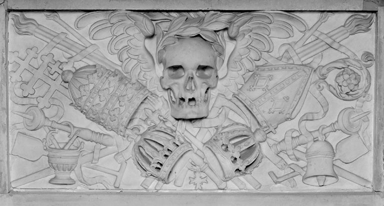 figure (La Rochefoucauld cardinal de, agenouillé, prière, coussin) ; figure (garçon, agenouillé, draperie) ; livre ; chapeau ; représentation d'objet (mitre, tiare, croix, bénitier, couronne, cloche, pelle) ; crâne