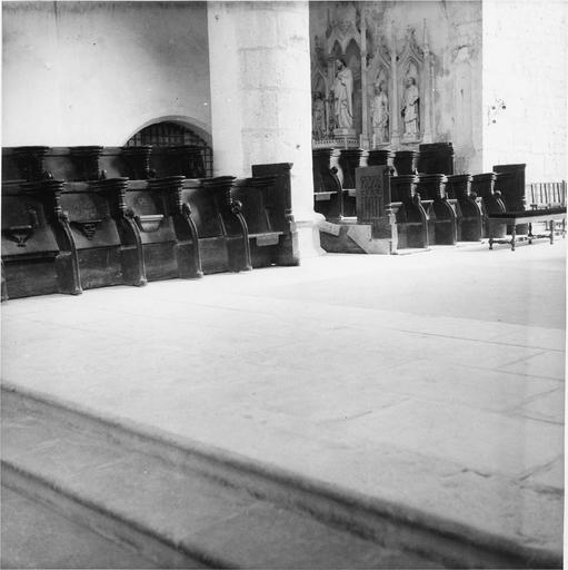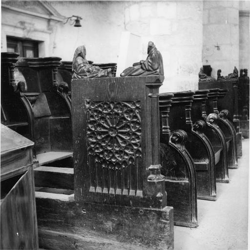 Ces stalles ont probablement été réalisées sous Etienne de Morel vers 1490. Elles étaient alignées contre les arcades latérales et sur le revers du jubé jusqu'en 1792. Certains éléments de ces boiseries ont été démontés à la Révolution pour orner la bibliothèque du château. devenue propriété communale depuis son acquisition, ils sont toujours visibles dans le bureau du maire.