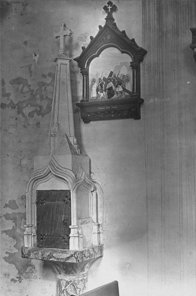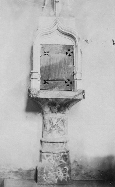 Armoire rectangulaire surmontée d'une moulure en accolade et d'un édicule à clocheton à crochets sur les arêtes et croix sommitale, reposant sur un pied cylindrique mouluré ; face antérieure fermée par une porte ancienne en bois.