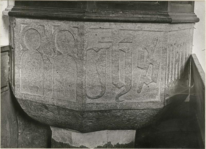 De forme octogonale, ces fonts baptismaux portent sur deux faces de la cuve une inscription. Les autres faces sont ornées de fenestrages.