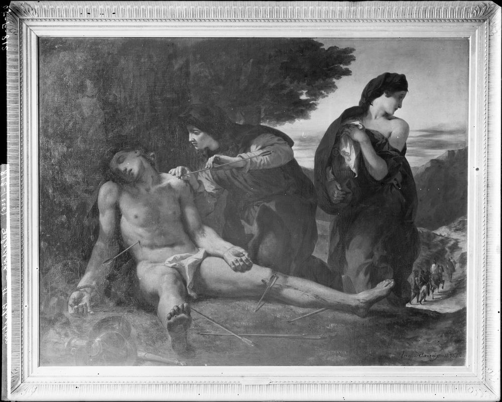 Ce tableau, exposé au Salon de 1836 sous le numéro 499, fut acquis pour 3000 francs par l'Etat, puis envoyé en dépôt à l'église de Nantua à la demande du député Girod de l'Ain (AD de l'Ain : série T). Vendu le 12 mai 1869 par le conseil de fabrique à M. Brame pour la somme de 23000 francs pour achever de payer l'orgue, la cour d'appel de Lyon annulera la vente le 21 décembre 1873 au motif que le tableau appartenant au domaine public est inaliénable. Dans l'inventaire des biens dépendant de la fabrique paroissiale de Nantua réalisé le 6 février 1906, le tableau est mentionné dans la rubrique I. Objets mobiliers garnissant l'église paroissiale, dans la nef nord : n? 4/ martyre de st Sébastien, toile, 1836, par Eug. Delacroix (AD de l'Ain. Série V : 8V47). ? Lui seul [Eugène Delacroix], peut-être, dans notre siècle incrédule, a conçu des tableaux de religion qui n'étaient ni vides et froids comme des ?uvres de concours [?] Le Christ aux oliviers, le Saint Sébastien, avaient déjà témoigné de la gravité et de la sincérité profonde dont il sait les empreindre. ? C'est ainsi que Baudelaire évoque le tableau de Delacroix représentant Saint Sébastien soigné par Irène dans son Salon de 1846, dix ans après son exposition au salon de 1836. Il vante ici l'expression des sentiments qui émanent de l??uvre, au-delà de son sujet religieux, et qui la rattachent au romantisme qui ? n'est précisément ni dans le choix des sujets, ni dans la vérité exacte, mais dans la manière de sentir ? (Baudelaire, Salon de 1846). À l'heure du renouveau de la peinture religieuse, qui répond à la nécessité de meubler les églises dépouillées à la Révolution autant que les nombreuses églises édifiées au cours du XIXe siècle, Delacroix a fourni assez peu de sujets religieux, mais il a su y apposer le sceau du romantisme en s'éloignant des représentations académiques empreintes d'une froide solennité pour y introduire le mouvement de l'âme. Artiste cultivé, Delacroix n'a pu ignorer en son temps le courant du catholicisme libéral, institué notamment par Félicité de Lamennais, qui a placé la religion au c?ur de la société, et a pu influencer cette représentation d'une religion humanisée. Si le choix du sujet importe moins que la manifestation du sentiment dans la définition du romantisme selon Baudelaire, l'iconographie du martyre de saint Sébastien n'en est pas moins précisément respectée par le peintre. Saint Sébastien, originaire de Narbonne et élevé à Milan, sert comme soldat à Rome, fonction évoquée par le casque et l'épée au premier plan. L'empereur Dioclétien le condamne à être percé de flèches lorsqu'il découvre qu'il est chrétien. Ici, il est représenté après son martyre, au pied de l'arbre auquel il était attaché (parfois remplacé par une colonne), ce dont témoigne encore le lien à sa main droite. Sur le tableau, les bourreaux ayant accompli leur tâche s'éloignent par le chemin représenté en contrebas. Irène, veuve chrétienne vêtue d'un sombre drapé rappelant son deuil, le guérit en lui ôtant ses flèches, accompagnée d'une seconde sainte femme. Cependant, loin de certaines représentations idéalisées du saint aux yeux grand ouverts, qui ne laisse pas transparaître la souffrance, Delacroix exalte le sentiment de douleur à l'aide de procédés formels recherchés. En premier lieu, la composition du tableau en renforce la tension dramatique : la diagonale formée par l'alignement des trois têtes des personnages coupe celle que forme le corps inerte et alangui de saint Sébastien à l'endroit précis du geste d?Irène, qui ôte méticuleusement la flèche de l'épaule du saint. La mise en exergue de ce point douloureux de la scène invite le spectateur à la compassion, au sens étymologique du terme. Les yeux clos du saint et la position d'abandon de son corps, synonymes de mort, s'opposent à l'expression attentive et pleine de pitié d?Irène. Le regard de la seconde femme, plongé dans l'ombre, se tourne avec crainte dans la direction des bourreaux, dans une attitude p roche de la Médée que Delacroix exposera au salon de 1838. ? Chef de l'école moderne ? selon Baudelaire, Delacroix n'en oublie jamais pour autant la tradition, où il puise des références qui sont clairement apparues aux critiques du Salon de 1836. Qualifiée de ? la plus belle page du Salon ? par Théophile Gautier, qui évoque à son sujet Pierre de Cortone et Carlo Maratta, le Saint Sébastien renvoie à la couleur du Titien pour Gustave Planche dans la Chronique de Paris (1836), au dessin de Raphaël et à l'école vénitienne pour Thoré Burger dans Le Siècle (1837). Au XXe siècle, les historiens de l'art sont allés plus loin dans l'exégèse stylistique. Plusieurs ?uvres de Michel-Ange ont été évoquées : la Madone de Bruges et la Nuit de la chapelle Médicis pour les deux femmes, l'Aurore de la chapelle Médicis et l'Esclave mourant pour saint Sébastien. La position des jambes de saint Sébastien, au raccourci osé, a trouvé un parallèle chez Rubens dans une Lamentation (1614, Vienne), et surtout une Trinité (1620, Anvers) dont Delacroix a effectivement laissé des dessins certainement d'après gravure.La multiplicité de ces sources d'inspiration ne saurait enlever à Delacroix l'originalité de sa manière, servie par une maîtrise technique remarquable dans l'usage habile du raccourci et le jeu subtil des ombres. Il produira six variantes sur le même sujet, dont un tableau exposé au Salon de 1859. Le tableau de Nantua présente cependant une histoire particulière. Acheté par l'État pour 3000 francs au Salon de 1836, il est envoyé en dépôt dans l'église Saint-Michel de Nantua en 1837 à la demande du député Girod de l'Ain. Est-ce en raison de la nudité de l'épaule d'une des femmes ou celle du saint Sébastien (qui n'est pas sans évoquer l'attitude du faune Barberini), ou bien pour achever de paye