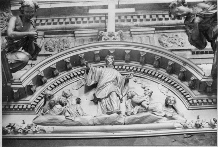 Retable architecturé de la chapelle nord, à fronton cintré sculpté en bas-relief de saint François Xavier guérissant les pestiférés, et à corniche surmontée par deux anges en prière.