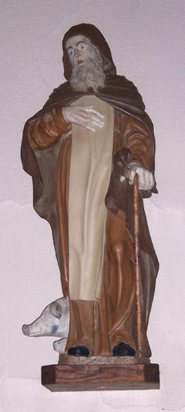 Saint Antoine, barbu est vêtu d'une cape avec capuche rabattue sur la tête, main droite posée sur le coeur, main gauche appuyée sur une canne en forme de tau, petit cochon à ses pieds.