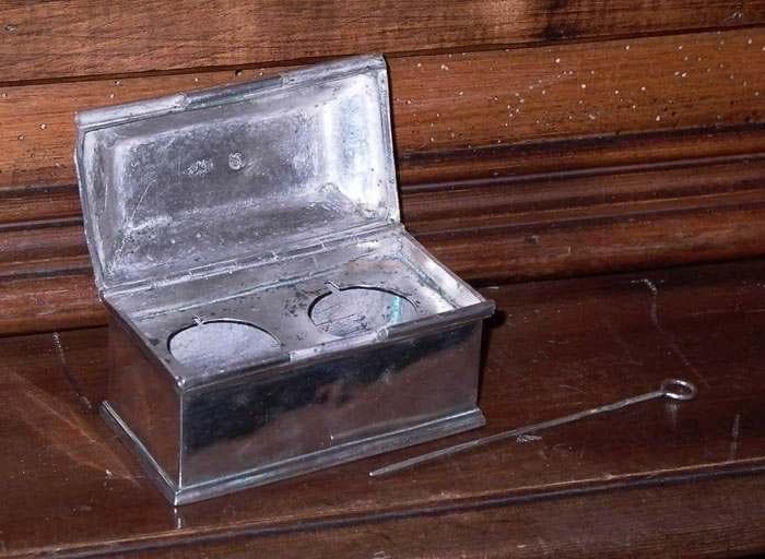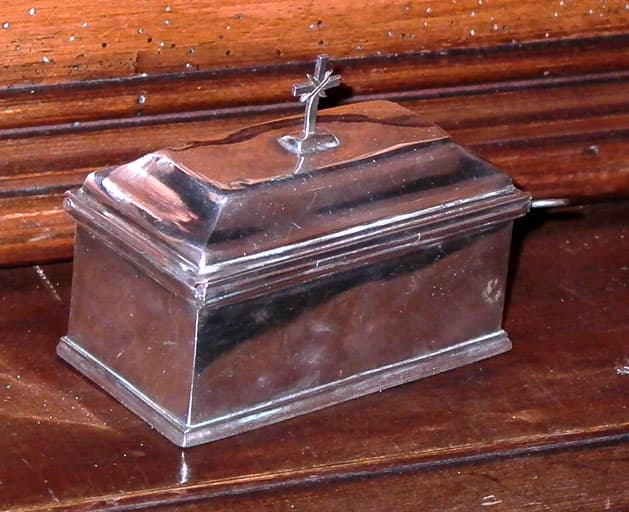 Coffret de forme rectangulaire surmonté d'une petite croix, tirette pour la fermeture. A l'intérieur, plaque perforée pour recevoir deux ampoules circulaires (disparues).