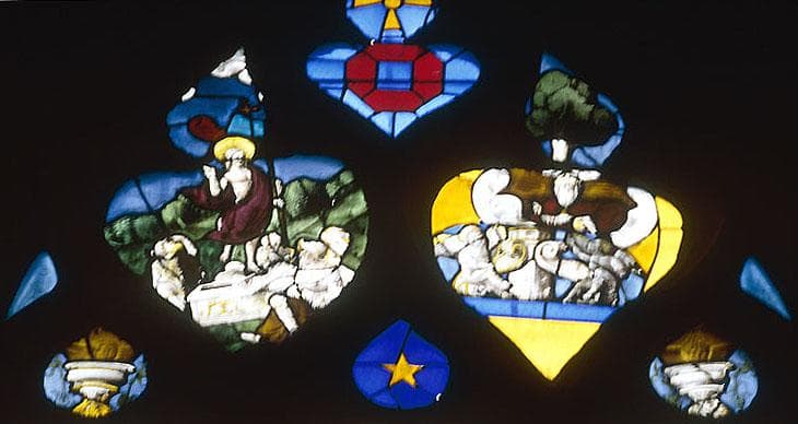 Verrière à personnages : Résurrection du Christ; Vierge des 7 Douleurs ; saint Pierre Chanel ; Saint Jean-Marie-Baptiste Vianney, curé d'Ars