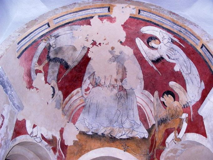 Décors géométriques sur l'intrados de l'arc ; portée de musique sur le piedroit sud ; personnage sur le piedroit nord ; Christ en majesté et tétramorphe lacunaire dans l'abside.