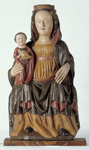 La Vierge est assise selon la coutume romane en position frontale maintient l'Enfant Jésus, légèrement cambré, debout sur son genou droit, ce qui est plus rare ; les mains sont longues et fines ; elle porte un ample et long voile vert sombre savamment plissé (plis caractéristiques en forme de coeur au niveau des genoux), sur une robe ocre à taille haute dont les plis viennent se casser sur le dessus des chaussures ; l'Enfant, au visage rond et placide porte des cheveux bouclés, tient un globe dans ses mains comme maître du monde ; la Vierge devait porter une couronne par dessus le voile. Les plis des vêtements sont assez symétriques, les doigts de la Vierge fins, toujours dans la tradition romane, mais le visage est moins hiératique que celui des anciennes Majestés . Comme la Vierge de Ramasse, celle-ci portait une couronne sculptée de fleurons, faisant corps avec la tête. On l'a retaillée par la suite pour adapter un diadème en verroterie.