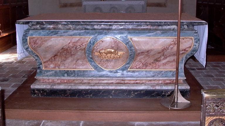 Autel de forme galbée en chêne peint en faux marbre polychrome, saumon et vert ; sur le devant d'autel, dans un médaillon circulaire, agneau couché sur la croix et sur la bible aux 7 sceaux , en tilleul doré.