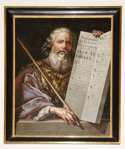 Personnage de Moïse en buste richement vêtu ; 10 articles des tables de la Loi parfaitement lisible tenu par le personnage qui fixe le spectateur.