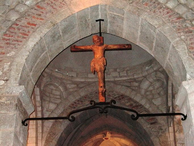 Bois décapé, ciré sur poutre de gloire en fer forgé.