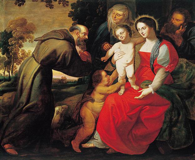 Il représente la sainte Famille avec saint Antoine de Padoue, sainte Elisabeth et saint Jean : saint François se penche respectueusement vers l'enfant Jésus debout sur les genoux de sa mère, la Vierge Marie ; Joseph se tient en retrait ; le petit saint Jean, avec sainte Elisabeth, semble vouloir jouer avec Jésus.