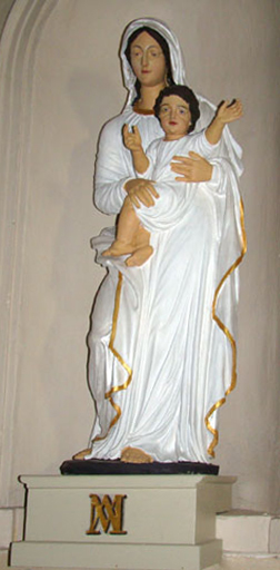 La Vierge légèrement déhanchée maintient l'Enfant Jésus sur sa poitrine ; il se tient de face, les bras levés, les jambes croisées. Elle est vêtue d'une robe blanche avec liseré or et porte un voile sur la tête. L'Enfant porte une tunique plissée blanche.