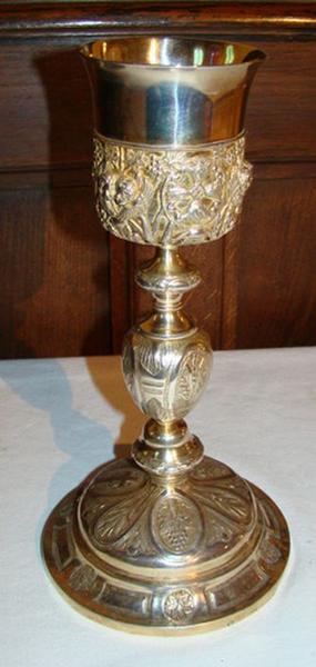 poinçons sur le pied, la coupe et la fausse coupe ; poinçon de petite garantie sur la tige ; poinçon d'orfèvre (sur le pied) : dans un losange vertical initiales C et B de chaque côté d'une ancre ; poinçon de garantie (coupe) : 6 Hercule 7, poinçon insculpé entre 1819 et 1838 ; poinçon de titre : dans un hexagone homme barbu de profil à droite (tête de Socrate), poinçon insculpé entre 1819 et 1838 ; poinçon : dans un rond, lettre T avec une espèce de parasol (?)
