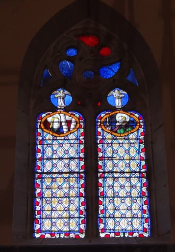 Ensemble de 4 verrières à personnages saint André et saint Paul, 2 anges musiciens ; blason des Machard ; 2 choux décoratifs