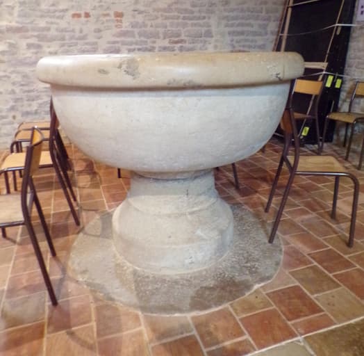 Fonts baptismaux en pierre ; cuve circulaire de grandes dimensions reposant sur un pied circulaire.