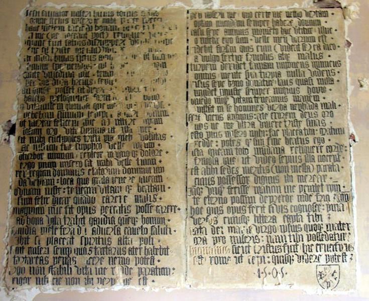 2 pierres côte à côte enchâssées dans le mur ; cette inscription est présentée sur deux colonnes ; gravée peinte en écriture gothique sur pierre.
